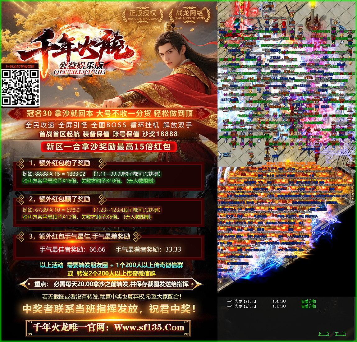 1.将宣传图转发朋友圈 + 1个200人以上传奇微信群 或 转发2个200人以上传奇微信群